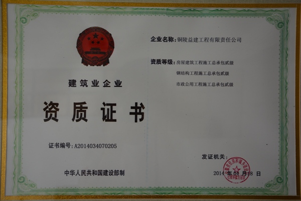 2014年4月18日,通过益建公司全体员工的辛勤努力,公司的市政公用工程施工资质升级工作取得了圆满成功。在原有"市政公用工程施工总承包三级"的基础上取得了“市政公用工程施工总承包二级”。至此,我公司已形成“房屋建筑工程施工总承包二级”、“市政公用工程施工总承包二级”、“钢结构工程专业承包二级”、钢结构生产、彩板制造,及建筑材料和工业金属材料销售为一体的综合型经营企业。